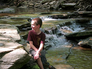 So, the end of the school year is nearly upon us, thank all the powers that be, and the rain that has been pretty much a constant companion throughout April took a brief break as well. With the cessation of rain came 81 degree weather with almost total humidity, but I am not complaining. It was enough that I was able to take the boys on our first, abbreviated Once-A-Wednesday Adventure of the Adventure Season. Limited time, funds, and gas made the creek on Colvin's Bend road an ideal destination. It is always a favorite, anyway. Tell a small boy he's allowed to jump in the water with his school shoes on... Happy boy!